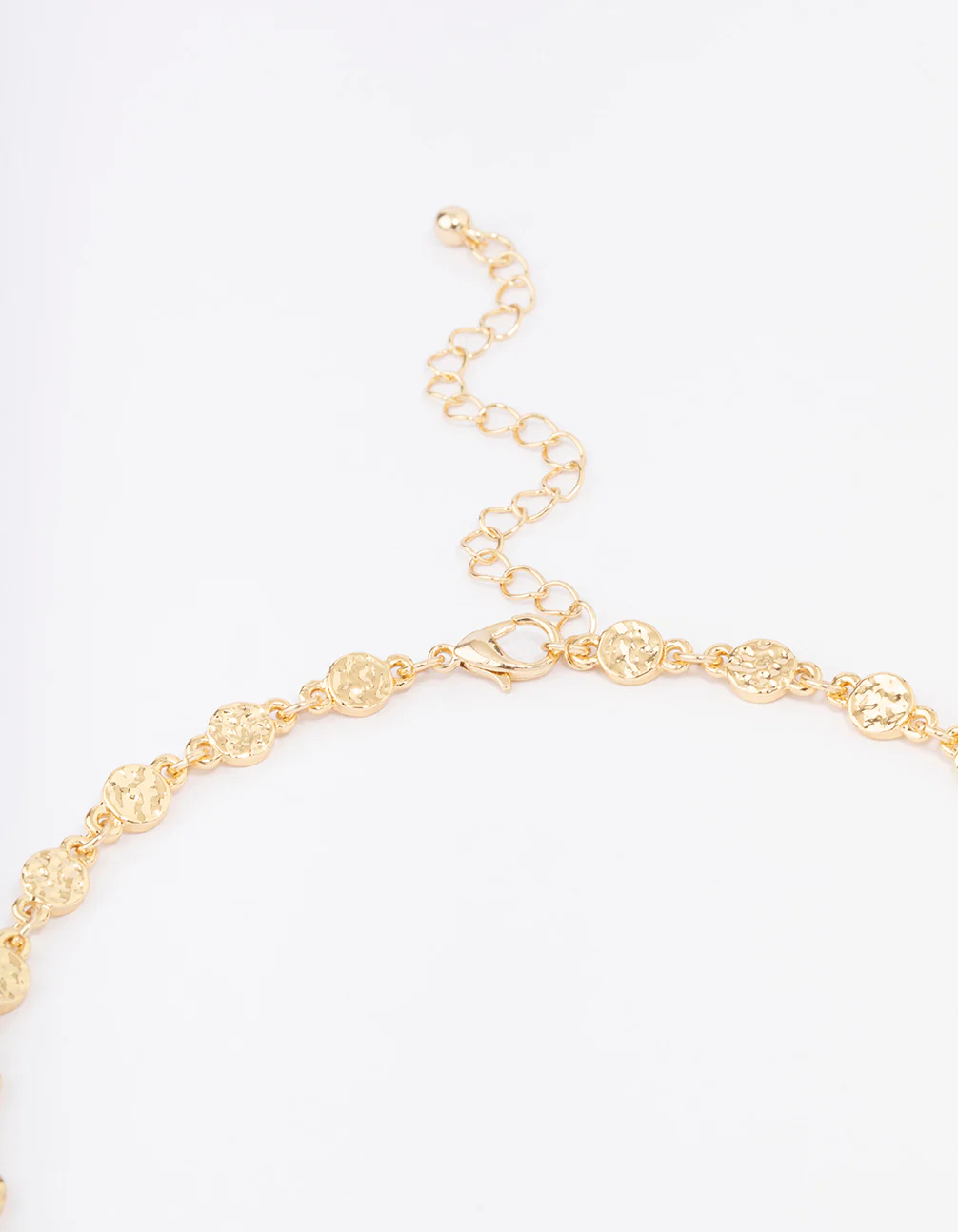 This gold plated necklace features a simple chain adorned with hammered discs for a textural finish to your outfit.