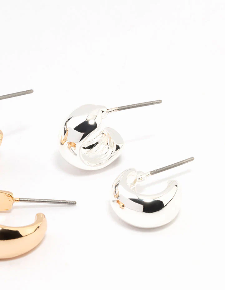 These earrings feature a set of three simple hoop earrings in different metals for a mix and match look. The hoops come in gold, silver and rose gold tones, allowing you to stack them for a chic, mixed metals style.